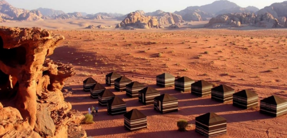 Dopo colazione si parte verso Piccola Petra. A differenza di Petra, nella quale i Nabatei vivevano e seppellivano i propri morti, Piccola Petra fu pensata per ospitare le carovane provenienti dall'Arabia e dall'Oriente, dirette fino in Siria ed in Egitto. Per permettere loro una sosta, dopo la traversata del Wadi Rum, i Nabatei scavarono prima delle piccole grotte nella roccia arenaria, arrivando poi a costruirne di grandiose, proprio per l’enorme numero di carovanieri che vi sostavano. Si prosegue poi verso il Wadi Rum, antico luogo di passaggio delle carovane che, cariche di merce preziosa, dalla penisola arabica si spostavano verso nord per raggiungere i porti del Mediterraneo. La sua bellezza è caratterizzata da montagne segnate dal tempo, da letti di antichi laghi oramai prosciugati e da altissime dune di color rosso intenso. In questi luoghi un ricercatore italiano, il professor Borzatti, ha ritrovato alcuni reperti del più antico alfabeto che si conosca, il Tamudico, che risale a 6.000 anni fa. Numerose inoltre sono le incisioni e le pitture rupestri scolpite nelle rocce della famosa “valle della luna”. Escursione in Jeep 4x4 per 2 ore. Sistemazione al campo tendato, cena e pernottamento sotto le stelle del deserto.