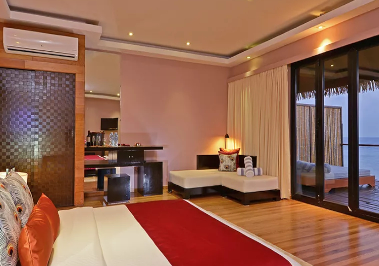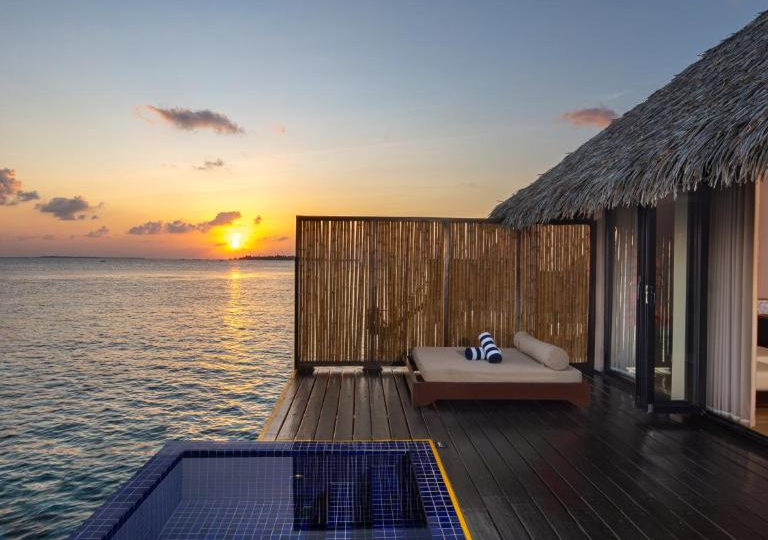 Esistono tre tipi di Water Villa: La Sunrise con vista su Malé, la Sunset con vista sull’ Oceano e la Honeymoon con una terrazza.