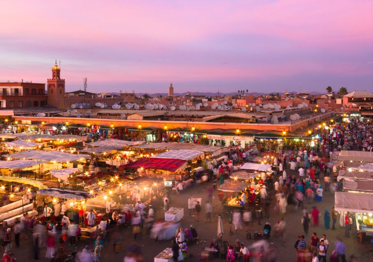 Nel pomeriggio, proseguimento della visita con gli animatissimi souk, i quartieri artigianali e la celebre piazza Djemaa El Fna, cuore pulsante della città.