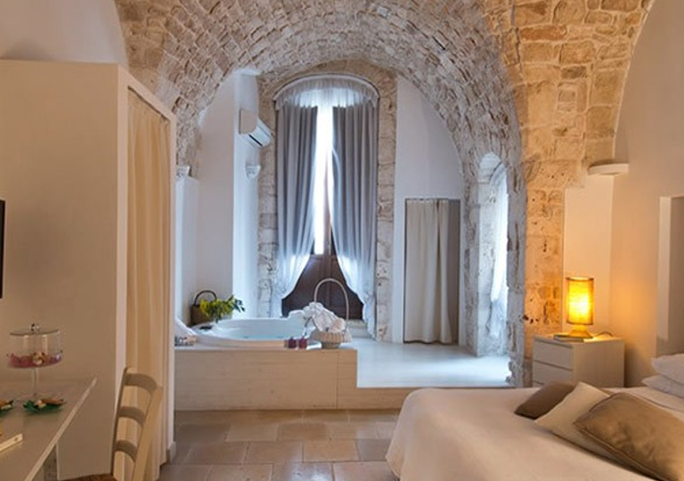 -Luxury Flat: ampi spazi insieme al bianco dominante della pietra, degli intonaci e delle travi e la grande vasca dromassaggio circolare sono le caratteristiche delle top suite. Arredi di charme e tutte le dotazioni utili quali aria condizionata, riscaldamento, frigobar, TV sat, telefono diretto, internet wi-fi gratis, cassaforte.