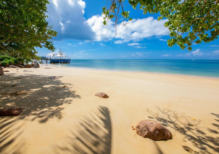 Affiancato da numerose piccole spiagge private che fanno parte della grande baia di Anse Bois de Rose. Gli ospiti hanno sempre accesso ad ampie aree prendisole; grandi terrazze di sabbia; amache con palme e lettini.