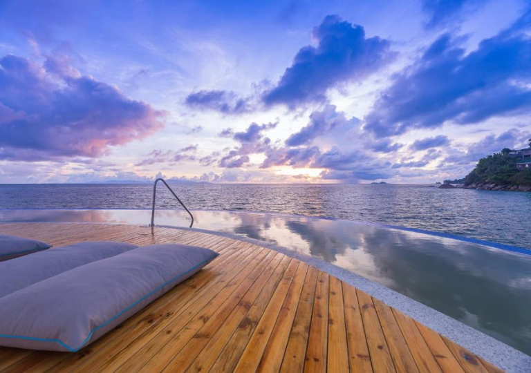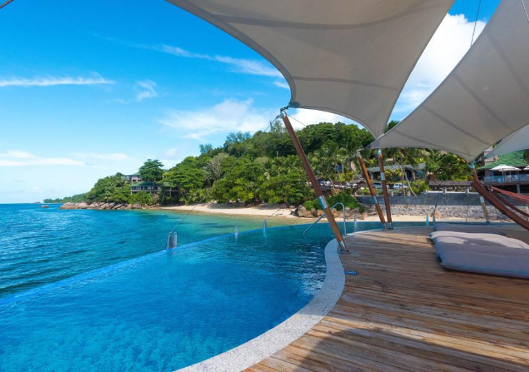 Le due magnifiche piscine, una dalla forma unica di Coco de Mer, si affacciano sull'Oceano Indiano e l'altra, arroccata su uno sperone di granito con vista a 270 gradi sull'oceano, sulle Black Parrot Junior Suites.