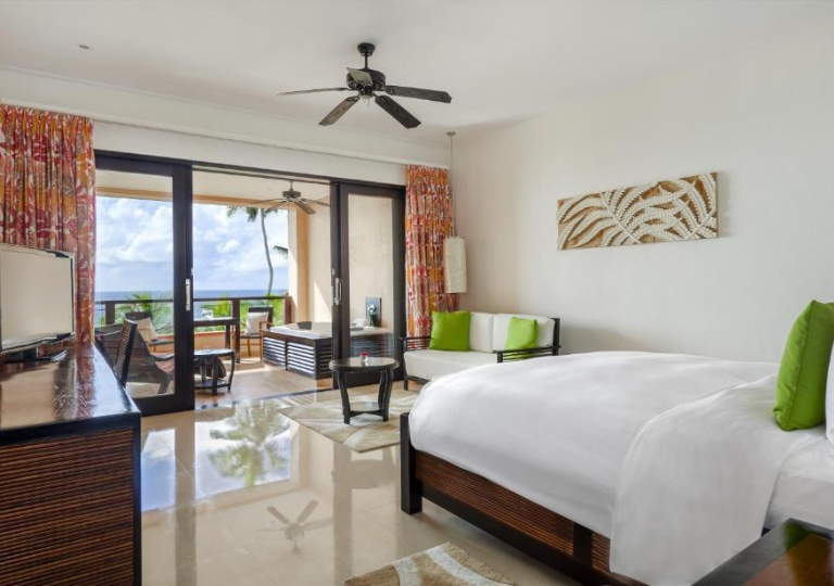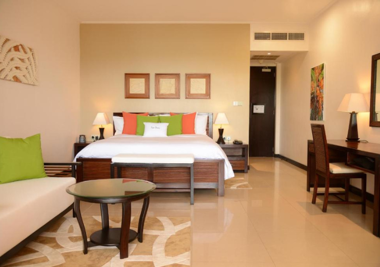 -Camera King Deluxe vista oceano: ampio bagno, balcone, vista oceano, divano, poltrona , Wi-Fi gratuito. Il massimo del comfort ti aspetta durante la tua vacanza alle Seychelles in questa elegante camera di66 mq. Il bagno è dotato di cabina doccia a pioggia e doppio lavabo. Ogni camera è dotata di TV HD da 42 pollici, connessione Wi-Fi gratuita e area salotto con un piccolo divano e una scrivania.