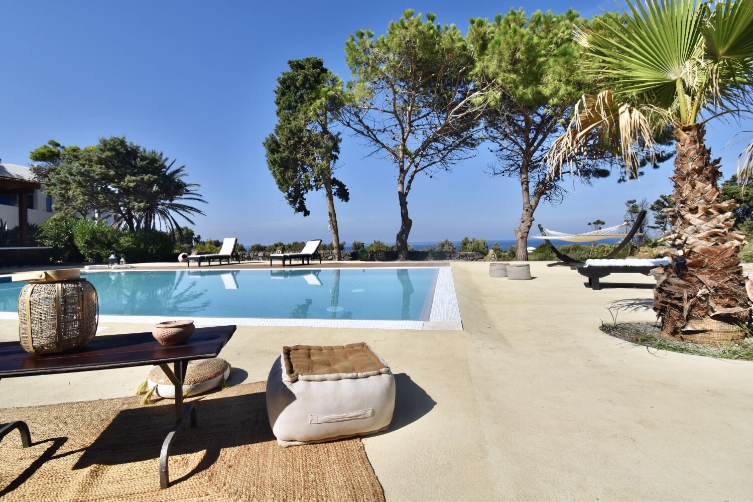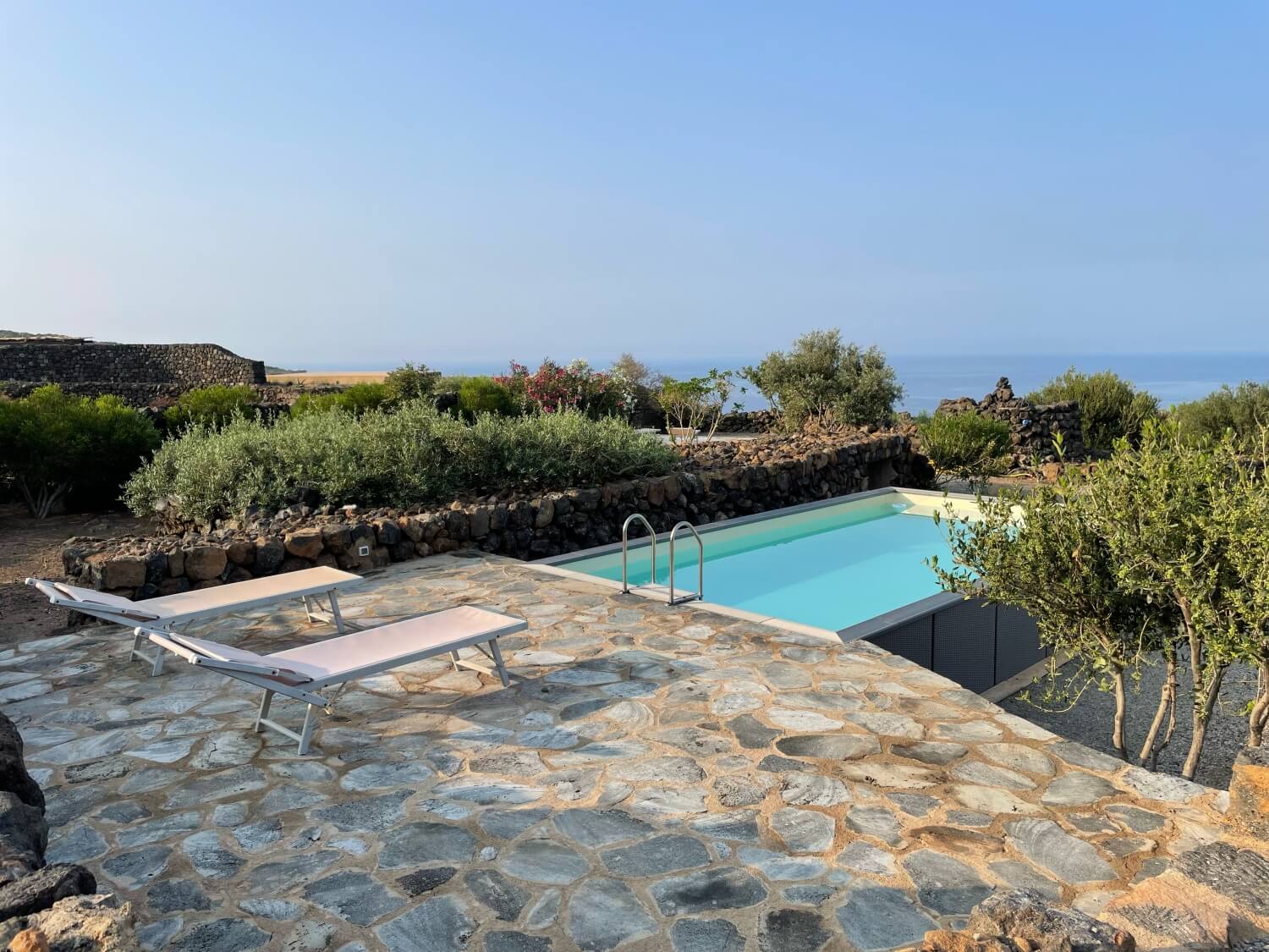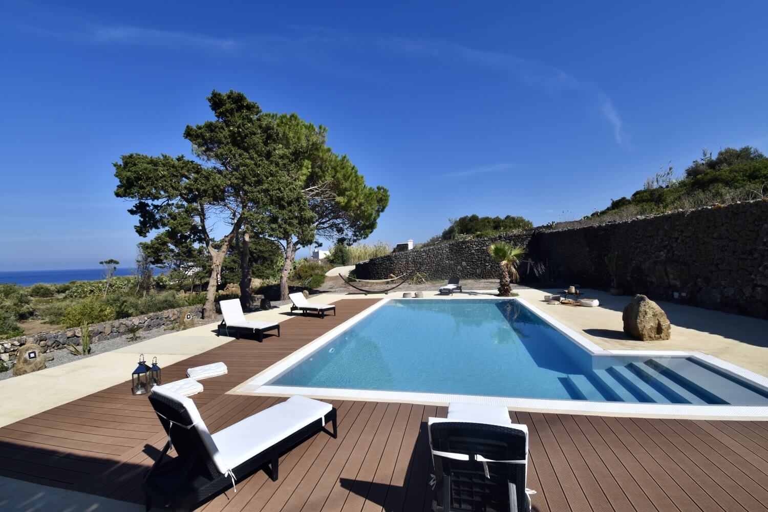 Ancor più interessanti sono gli spazi esterni: i terrazzamenti che tagliano i terreni, le verdi vigne, i bassi e larghi uliveti, le coloratissime bouganvillee e le longilinee palme arricchiscono i giardini e fanno da cornice a queste case.