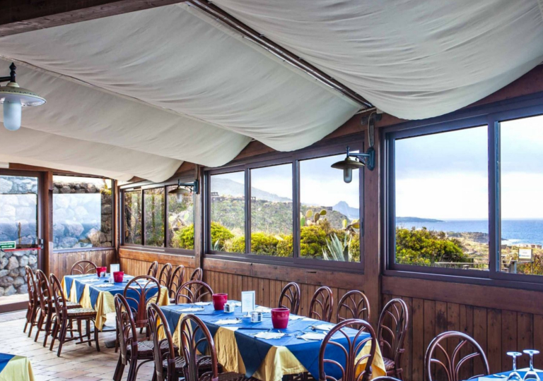 All'interno del corpo centrale è situato il ristorante panoramico. Le proposte sono varie e complete, arricchite dai sapori tipici panteschi. La prima colazione propone sia il dolce che il salato, il pranzo e la cena sono caratterizzati dal sistema show cooking: primi piatti saltati a vista e i secondi cotti alla griglia. I tavoli sono disposti sia all'esterno che all'interno con locale climatizzato.